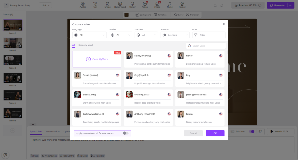 - Natural-Sounding AI Voices: This tool offers 2000+ AI voices, all powered by ElevenLabs, Google, and Microsoft. Additionally, content creators can select from a diverse range of voice styles, sentiments, and emotions to perfectly match their video’s intended tone and style.