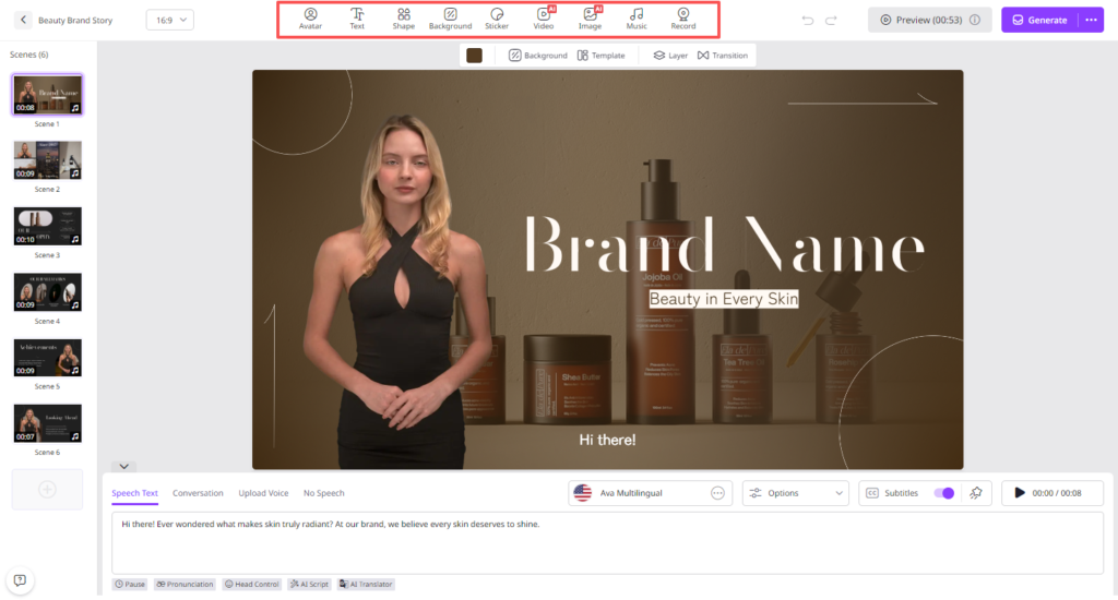 - Next, use the Online Video Editor to customize the AI video according to your needs. The program enables users to change the background, insert text, add music, and apply effects.